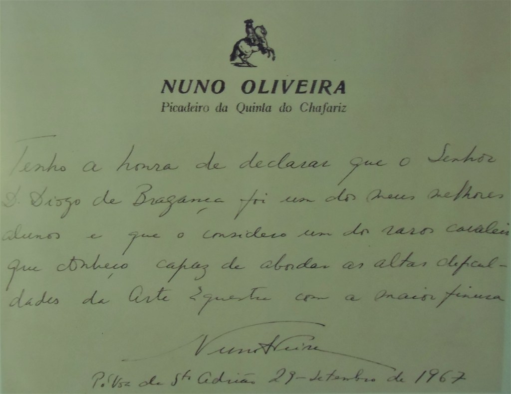 Trata-se da primeira obra impressa de D. Diogo de Bragança editada em França em 1975 , pela editora “ ODÉGE “ e traduzida por René de Bacharach . O meu exemplar é da segunda edição , já havendo uma 3ª, publicada pela “ BELLIN “ em 2012 . Com dedicatória do autôr ao Dr. Jorge Mota . O autôr que eu conheci muito bem , foi aluno do Mestre Nuno de Oliveira , e contemporaneo de grandes equitadores , morreu em 2012 com 81 anos . Foi o VIII Marquês de Marialva .
